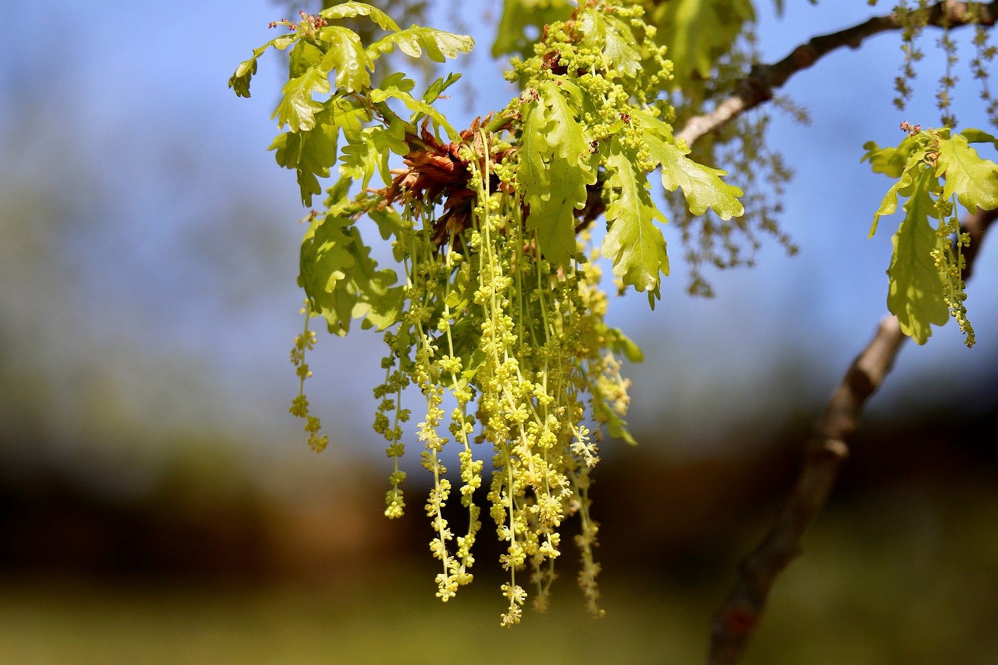 Suddenly, seemingly overnight, the bare branches of the red oak were covered in pale yellow-green catkins—long, drooping, finger-like clusters that hung down like tiny tassels or fringe.